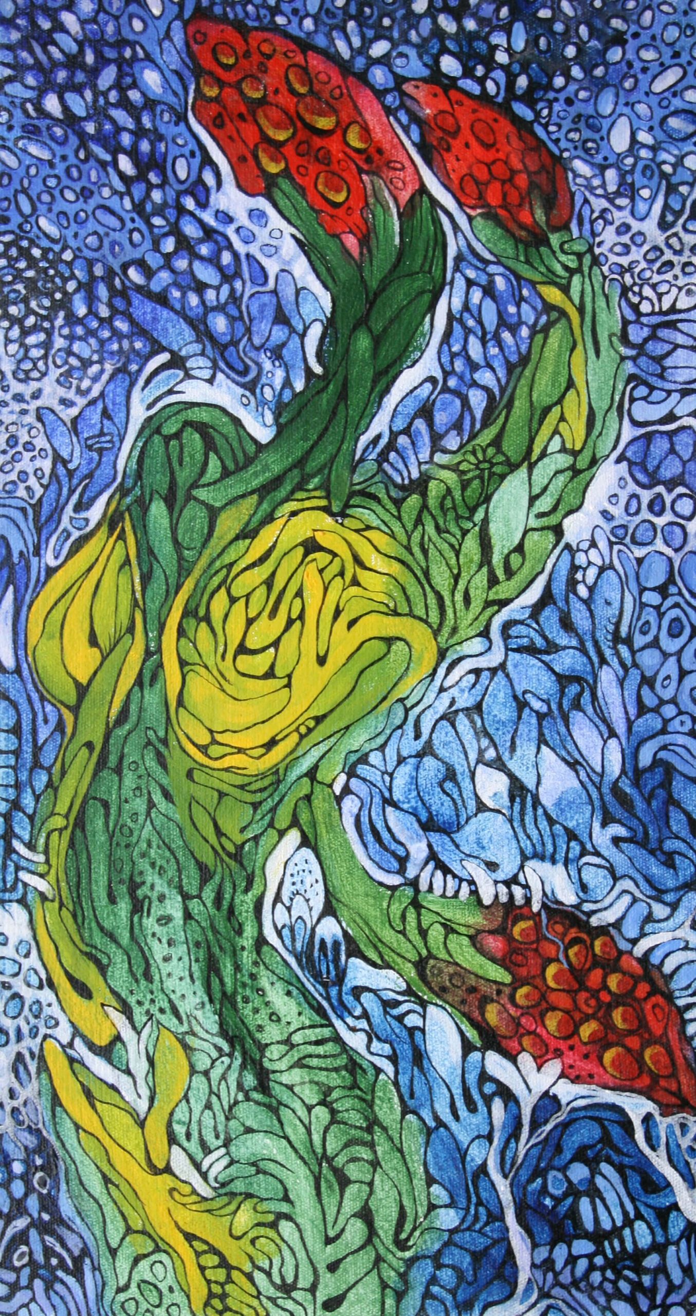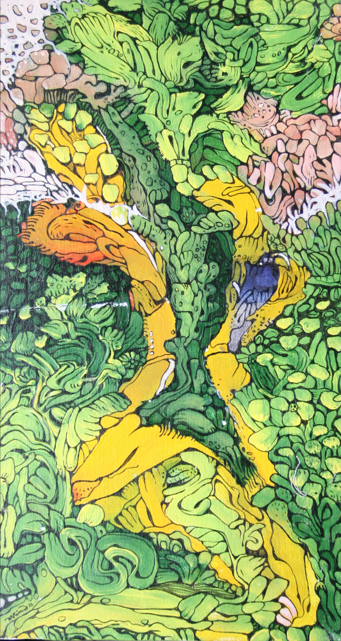 Unfortunately, our male-dominated society exhibits a shameful cowardice in recognizing women potentiality. They become afraid of the thought that social recognition of women’s potentials might pull down the fictitious castle of male-chauvinism. Man wish to see women as dull, inanimate objects, not able to challenge their authority. Man wants to keep their reign of control over women intact by denying women access to freedom. Man feels shaky whenever they sense the rise of women. In my paintings I wanted to pay my tribute to women’s all-winning capability. I feel that women are all-powerful. No matter how inviolable the hindrances are, women can come out victorious. It is in their very nature to reach out for the sky, because, for both Nature and women, only the sky can be the limit. They are meant for blossom, and so no obstacle is strong enough to hold them from blooming up to their full. I believe women possess the ability to transcend the mundane hindrances and reach out for the cosmos.